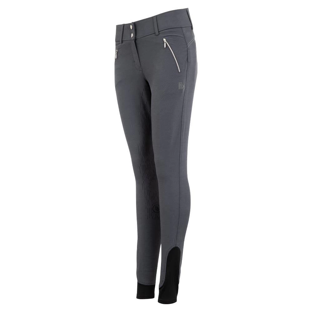Damesrijbroek met ritszakken aan de voorkant en een hoge elastische tailleband met riemlussen. De achterkant van de rijbroek is voorzien van ritszakken en een contraststiksel.