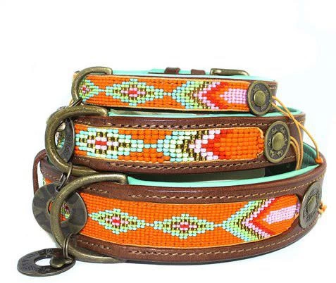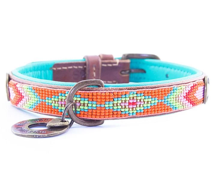 De Dog with a Mission Tiger Lily is een prachtige knal oranje leren hondenhalsband! De kralen zijn stevig in het leer genaaid en de binnenkant is gemaakt van zacht turquoise leer. Een absolute eyecatcher!
