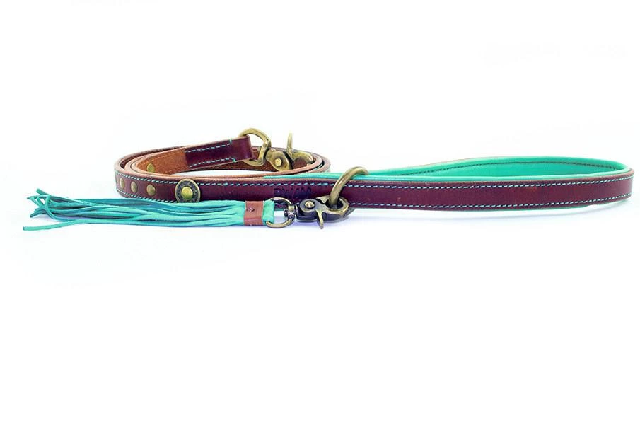 Mix enĀ match deze stoere leren Dog with a Mission hondenlijnĀ met een van de Dog with a Mission halsbanden! Deze riemĀ past bij alle Dog with a Mission halsbanden door het kenmerkende turquoise randje wat in alle producten terugkomt.