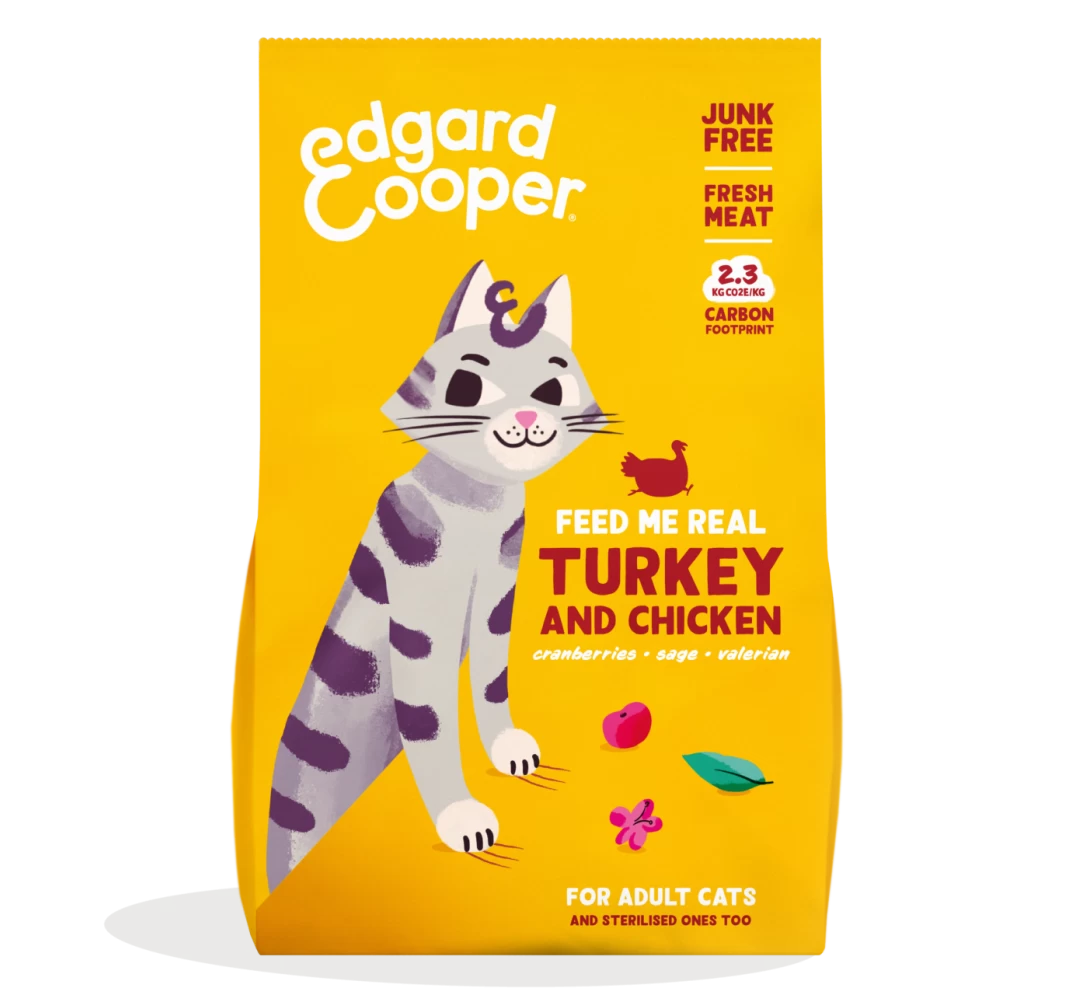 Edgard & Cooper kattenvoer Adult Kalkoen en Kip is een volledige voeding van graanvrije, krokante brokjes met verse vrije-uitloopkip en vrije-uitloopkalkoen. Echt eten en geen junkfood: ideaal voor volwassen katten, ook als ze gesteriliseerd zijn. Ze zitten boordevol vers vlees zonder kunstmatige of tot poeder verpulverde toevoegingen en zonder toegevoegde suiker.