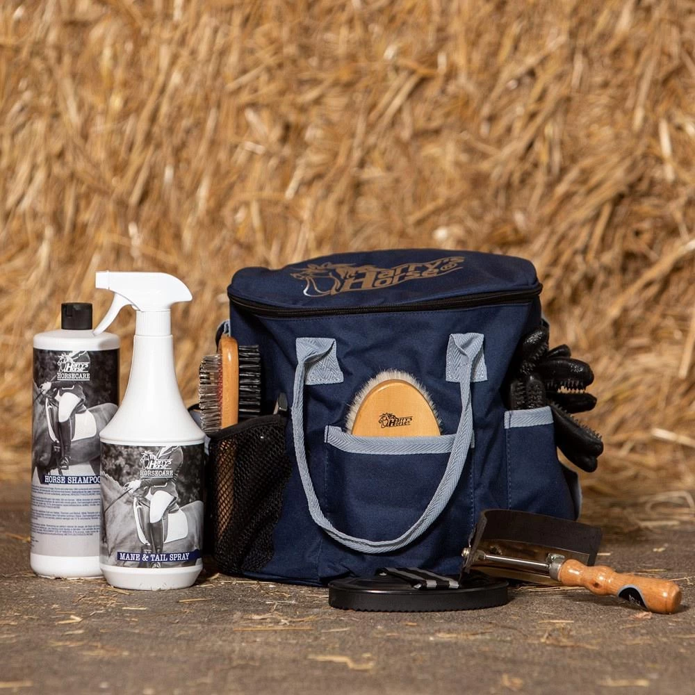 Harry’s Horse Cap- en Poetstas XXL is een praktische cap- en poetstas met voldoende ruimte voor al je borstels en bijvoorbeeld een helm. De tas heeft een deksel met dubbele rits en een afneembare en verstelbare schouderband. Stevige handgrepen en diverse zijvakken maken de tas helemaal af.