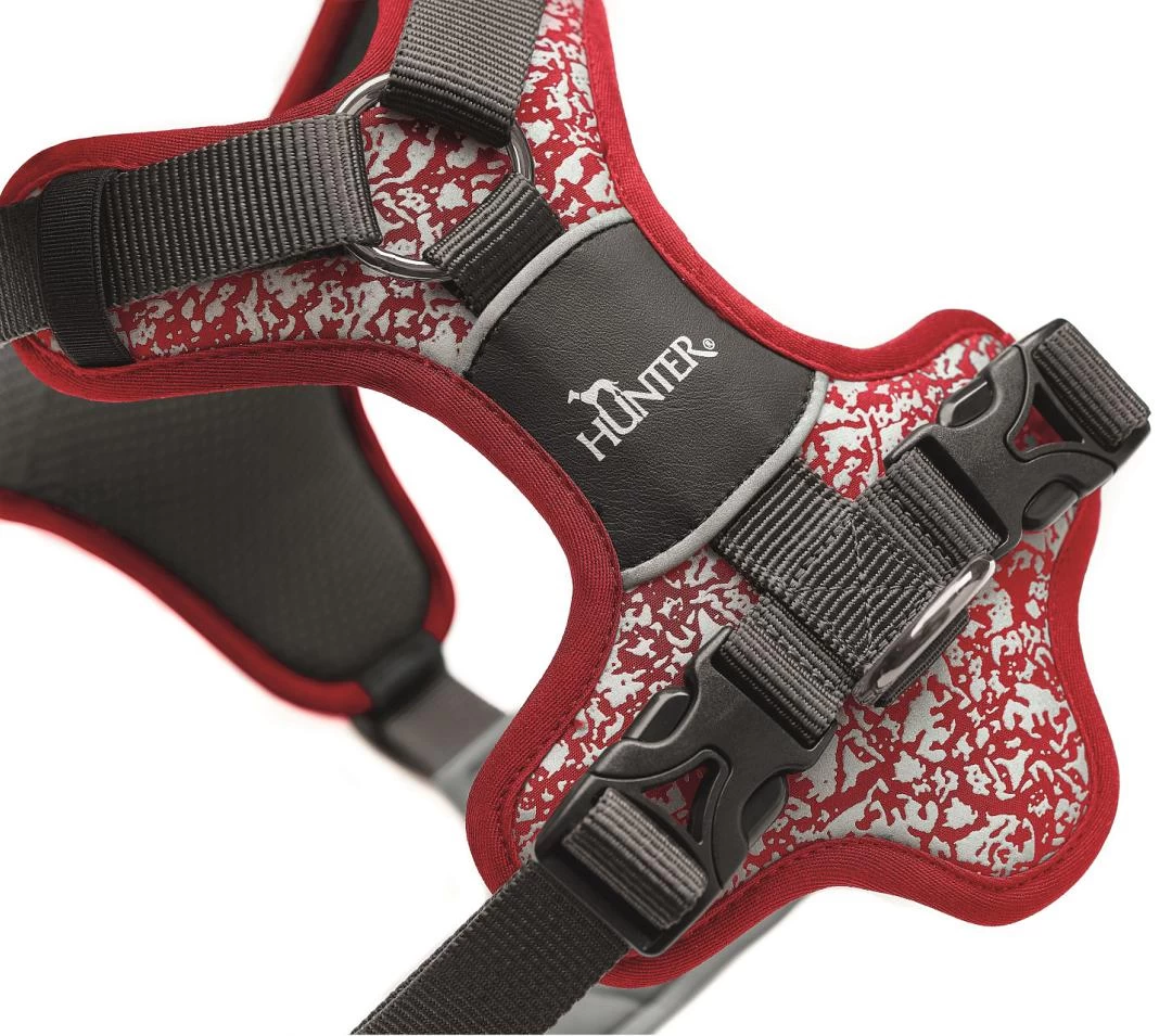 Hunter hondentuig Divo Reflective is een volledig verstelbaar tuig. Het tuig is verstelbaar op vijf verschillende punten, zoals op de nek, rug en borst. Daarnaast heeft het tuig een reflectieve print die over het gehele tuig loopt, wat zorgt voor extra zichtbaarheid in het donker.