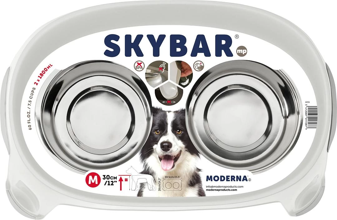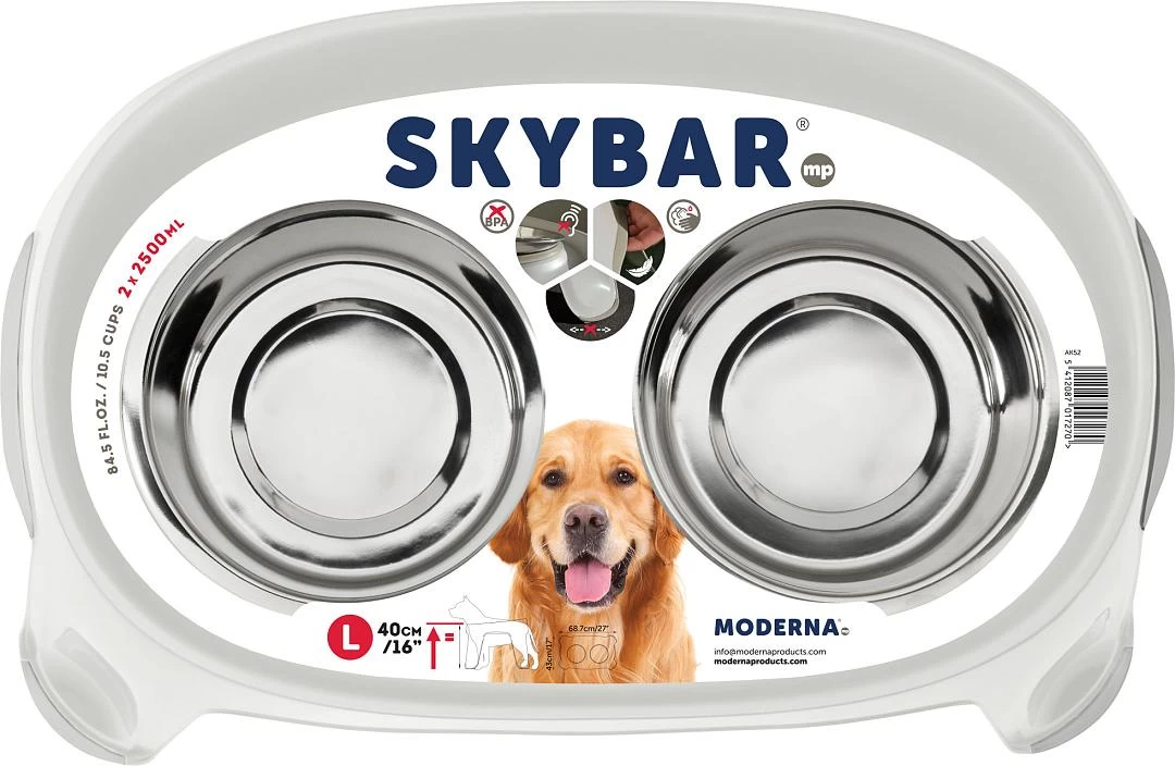 De Moderna dubbele voederstandaard Skybar helpt jouw hond comfortabel te eten en drinken. Voorzien van antislip onderaan de poten tegen het wegglijden, aan de zijkanten voor goede houvast tijdens het verplaatsten en rondom de RVS eetbakken, zodat deze geen geluid produceren tijdens het eten of drinken.