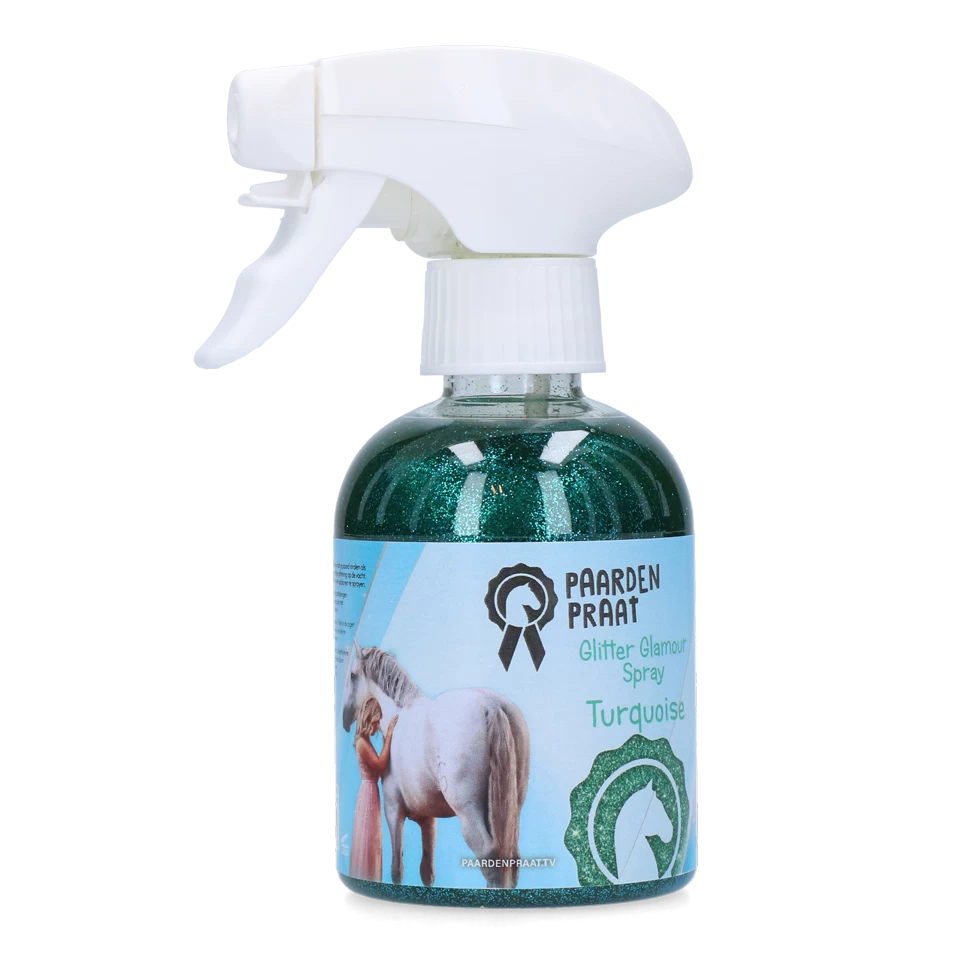 De Paardenpraat Glitter Glamour Spray Turquoise laat je paard of pony stralen als nooit tevoren! Het zorgt voor een prachtige glittering op de vacht, manen en staart en is met een borstel makkelijk te verwijderen.