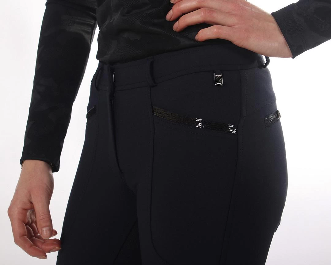 QHP Damesrijbroek Nowi Anti-slip Zitvlak is een chique rijbroek met een siliconen zitvlak in stippenpatroon voor goede grip. De pailletten op de zakken zorgen voor een opvallende verschijning. Hiernaast is de broek ook nog erg comfortabel door de zachte, stretchende stof.