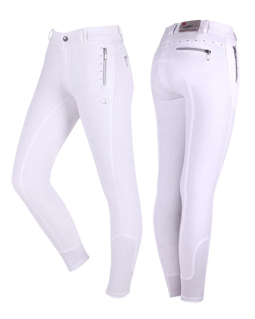 Rijbroek Isa is voorzien van een anti-slip zitvlak in een gestipt bloemenpatroon. De broek heeft een elegante uitstraling door de strass steentjes aan de achterkant en langs de faux ritszakken aan de voorkant. De rijbroek is aan de achterkant voorzien van twee zilveren faux ritszakken.