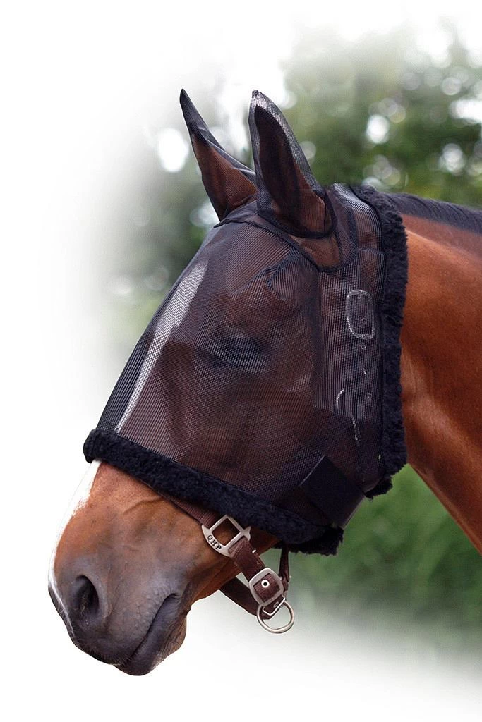 Deze QHP vliegenkap is van stevig materiaal met een fijne maas met oren. Hierdoor wordt het paard in de weide niet lastiggevallen door vliegen. Met een zacht bontje langs de rand en eenvoudig te bevestigen.