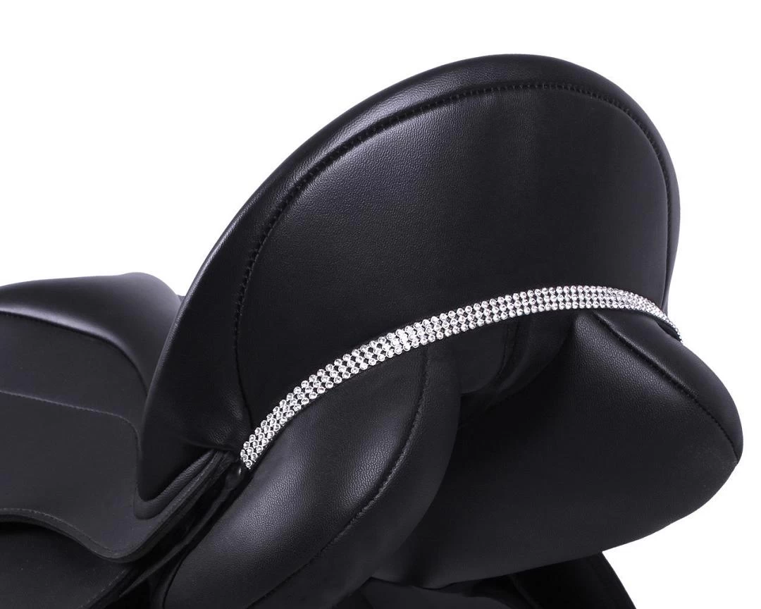 Het QHP zadelsieraad Madelon is bedoeld om de lepel van een zadel te decoreren. Het is te bevestigen door de verstelbare elastische lussen om de onderste zweetbladen te schuiven.