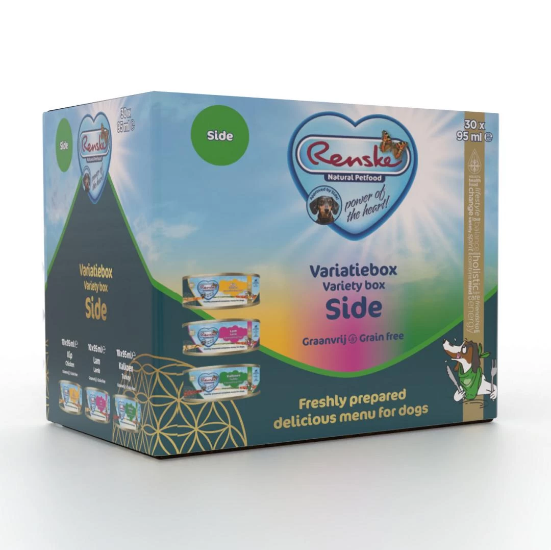 De Renske Hondenvoer Variatiebox Side Graanvrij is een handige variatieverpakking met drie heerlijke varianten Renske Vers Bereid 95 gr!