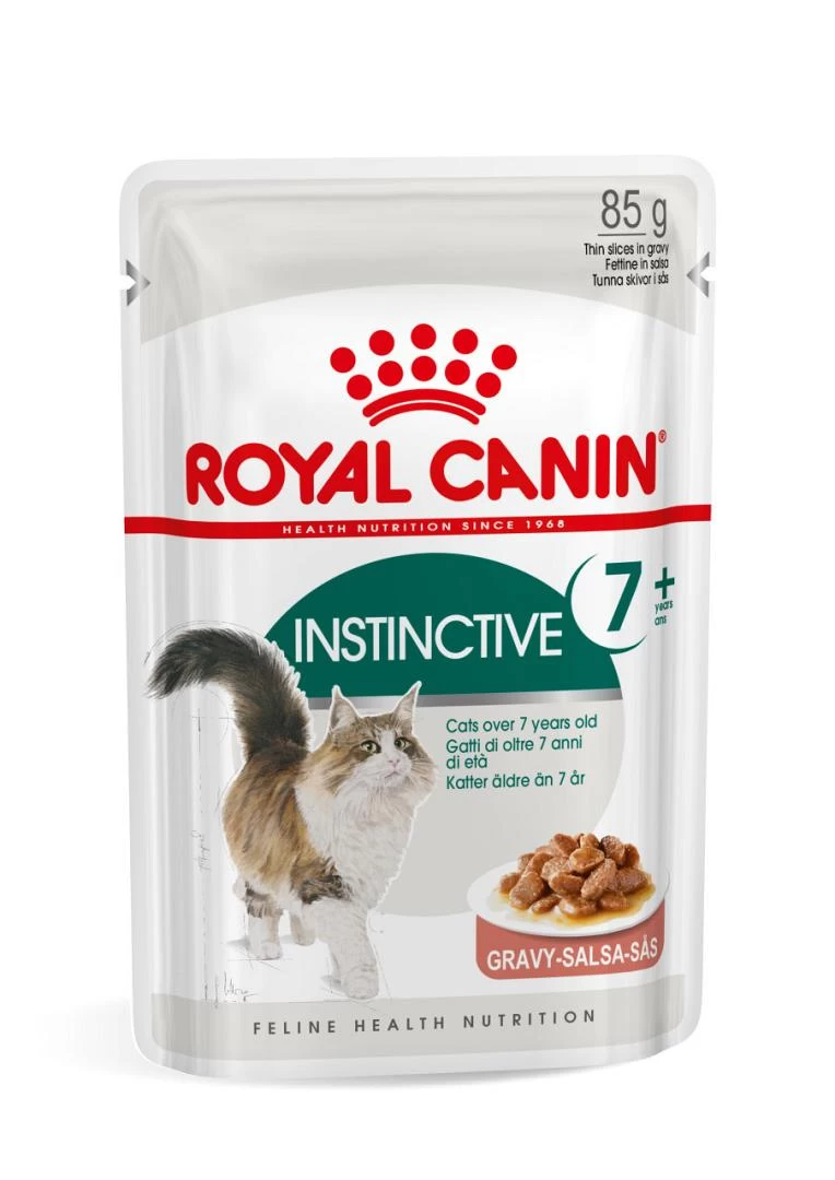 Royal Canin Instinctive 7+ in gravy zijn maaltijdzakjes met vleesbrokjes in saus voor katten ouder dan 7 jaar.Â