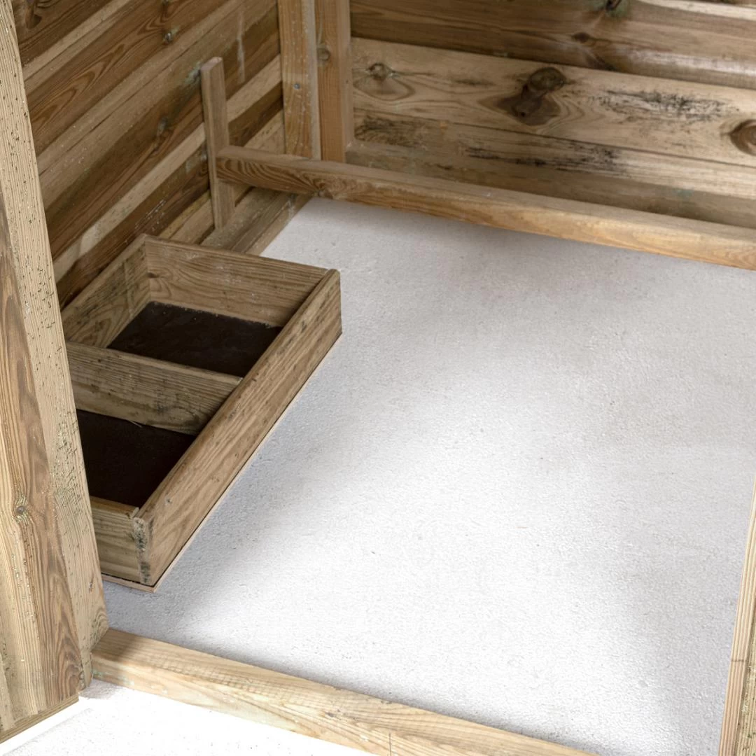 Voor een goede afwatering en bescherming op koudere winterdagen is het nachthok afgewerkt met rabatdelen en is het dak bedekt met stevig zwart dakleer. Het nachthok heeft een afmeting van 125 x 125 cm en is voorzien van een legnest voor de eitjes en een zitstok voor de nacht. Via een vrije doorgang kunnen jouw kippen of konijnen zo de ren inlopen. Deze ruimte is opgebouwd uit een frame van geïmpregneerde balken en een gaasafwerking voor zowel de wanden als het dak.