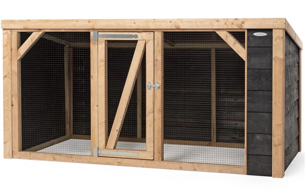 Aan de buitenzijde is het verblijf afgewerkt met Douglas balken en zwart potdeksel, en is er gekozen voor zwart gaas. Deze combinatie van materialen geeft een sfeervolle en stijlvolle uitstraling aan de Kippen- of konijnenren. De ren is aan 3 zijdes gesloten, waardoor jouw kippen of konijnen ook op regenachtige dagen droog kunnen scharrelen en rondlopen. Het hok is hiernaast voorzien van een toegangsdeur aan de voorzijde en een met dakleer bekleed dak. Dit zorgt ervoor dat er een goede afwatering op het verblijf zit, maar dat er toch voldoende licht in de ren kan komen.